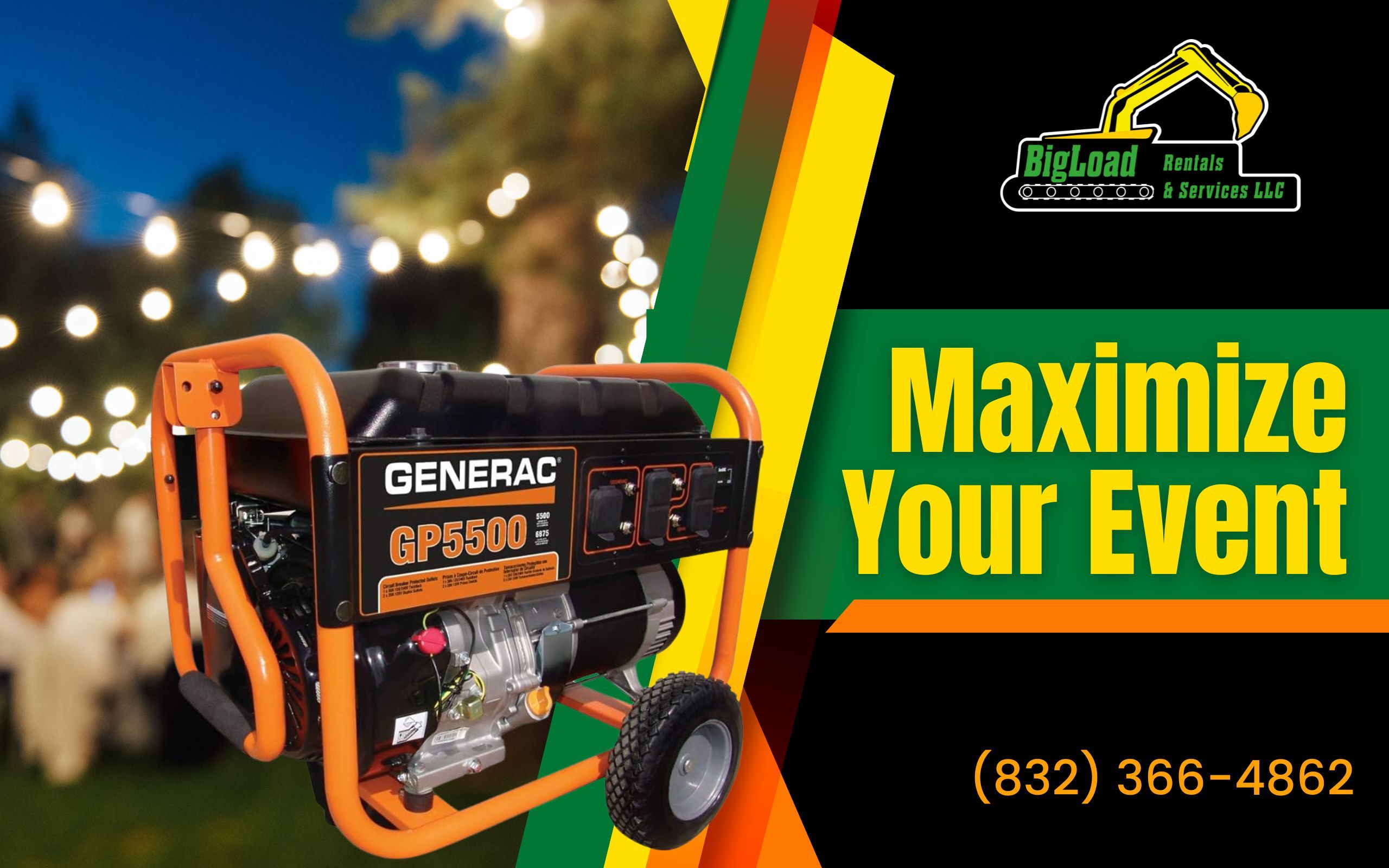 Ensure your outdoor event runs smoothly with reliable backup power from the Generac GP 5500. For more information and to explore rental options, contact BigLoad Rentals & Services, LLC at (832) 366-4862. Let us help you power your next event with confidence and efficiency!